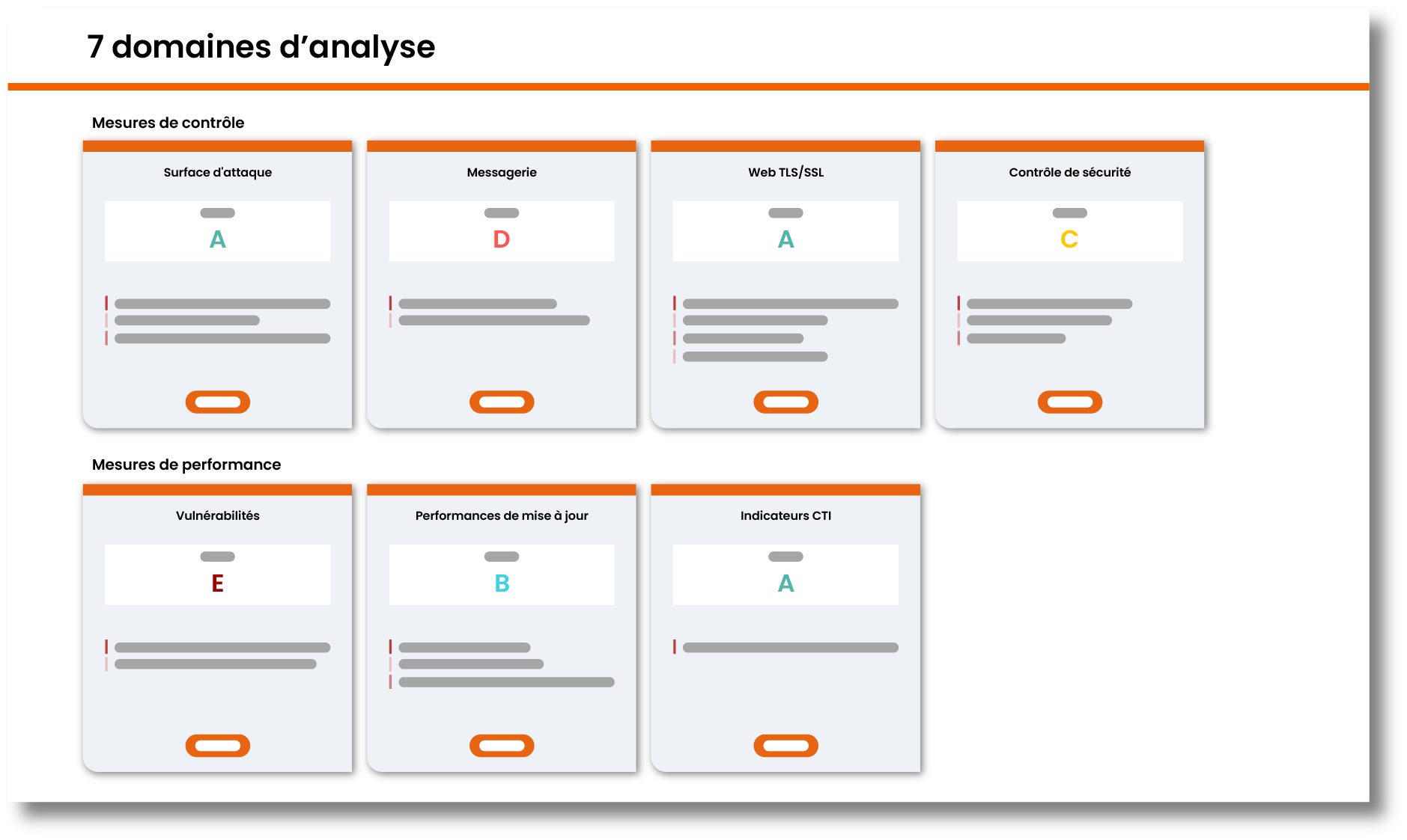 Security Rating® analyse automatiquement et de façon non intrusive l'ensemble des actifs numériques exposés publiquement sur Internet pour un domaine donné. L'analyse couvre 7 domaines : surface d'attaque, messagerie, Web TLS/SSL, contrôle de sécurité, vulnérabilités, performances de mise à jour et indicateurs CTI. Un score global de 0 à 1 000 est attribué, ainsi qu'une note de A à E pour chaque domaine. Le score est mis à jour quotidiennement pour refléter l'évolution réelle de la posture cyber.